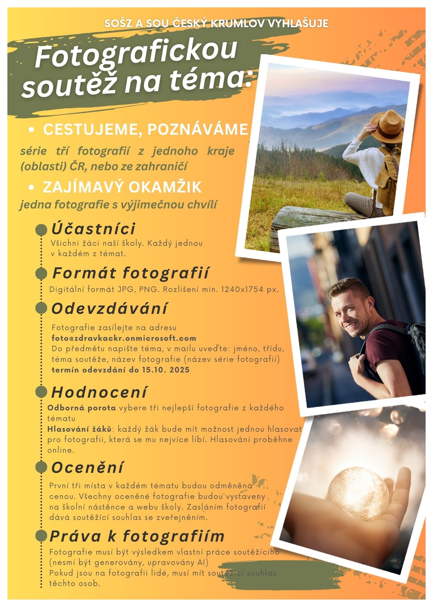 Škola vyhlašuje fotografickou soutěž pro všechny fandy fotografování, ale i pro začátečníky a vlastně pro všechny, kterým se podařilo vyfotit něco pěkného, zajímavého či šokujícího, a bylo by škoda se o to nepodělit! Pošlete fota do 15. 10. 2025 na foto@zdravkackr.onmicrosoft.com. Vše o podmínkách soutěže v připojeném letáčku.