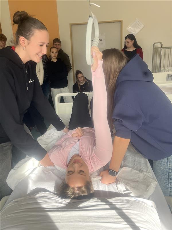 Na teoretickou část navázal praktický nácvik, během kterého si žáci vyzkoušeli různé techniky manipulace s pacientem – například správné přesuny na lůžku, polohování nebo pomoc při vstávání. Velká pozornost byla věnována správnému držení těla, zapojení velkých svalových skupin a využívání přirozených pohybových principů tak, aby nedocházelo k nadměrnému zatěžování zad.